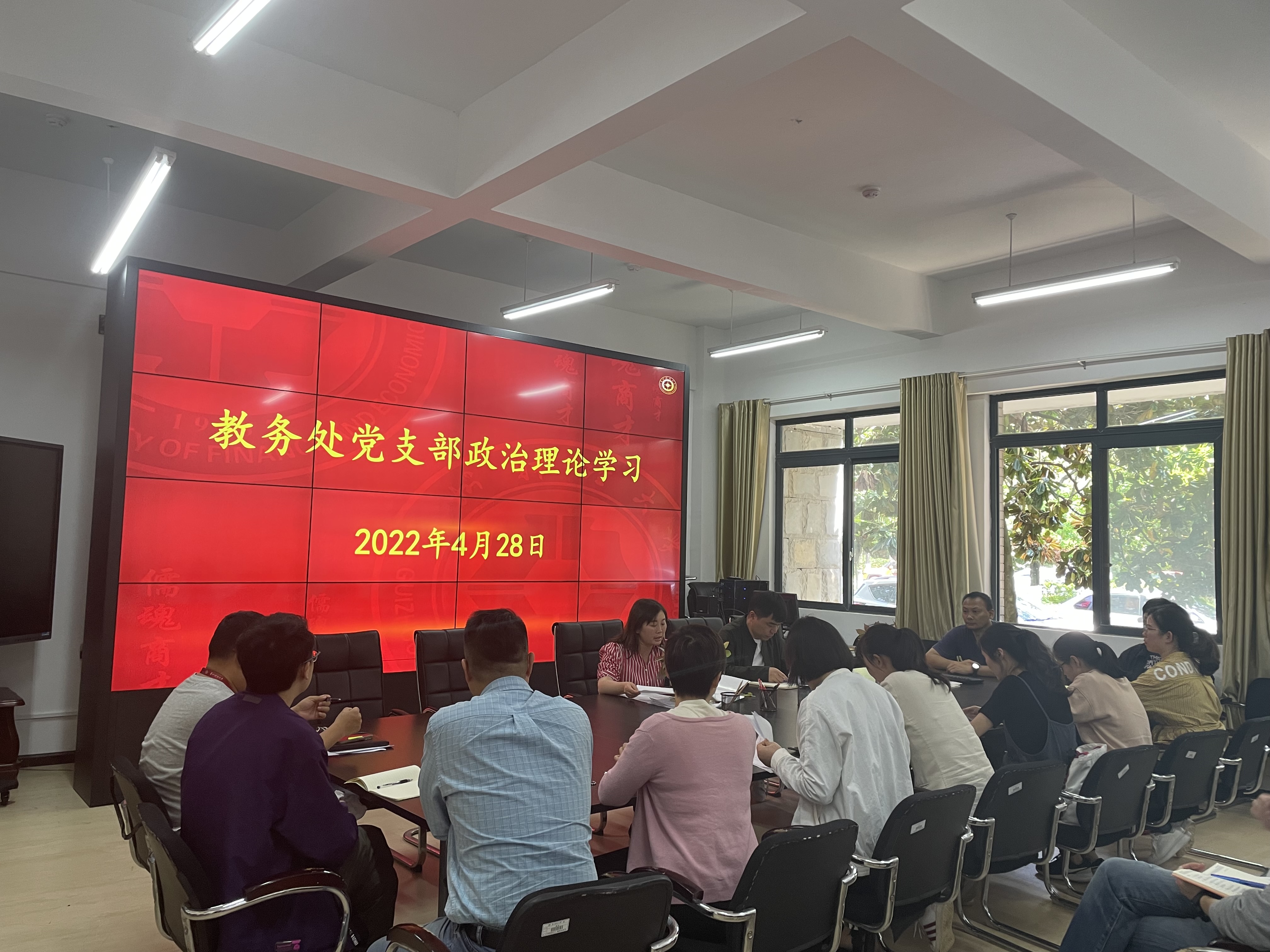 2022年4月28日下午,教务处党支部全体党员在立德楼142会议室召开政治理论学习。会议由支部副书记王倩兰主持。